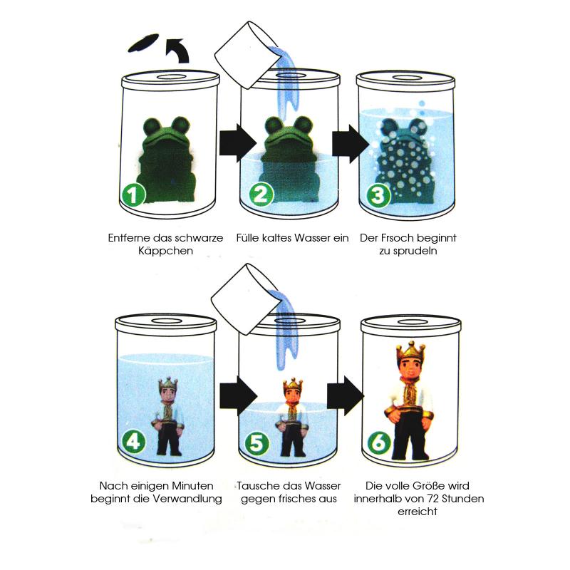 Wie war das noch gleich im Märchen...? Die Prinzessin mußte den Frosch küssen um an Ihren Traumprinzen zu gelangen. Der "Instant-Traumprinz" ist ein witziges Geschenk für alle, die Ihren Märchenprinz noch nicht gefunden haben. Küssen muß man den Frosch übrigens nicht. Ein bißchen Wasser und etwas Zeit genügen und aus dem unscheinbaren grünen Frosch wird ein bezaubernder Prinz. Um vollständig auszuwachsen benötigt der Prinz bis zu 72 Stunden.