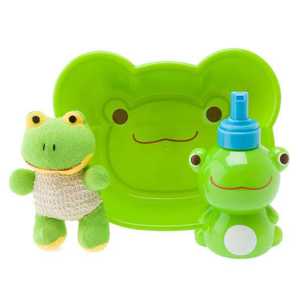 Das Set besteht aus einer Aufbewahrungs-Schüssel mit Frosch-Gesicht, einem Spieltier für die Badewanne und einem witzigen Seifenspender.