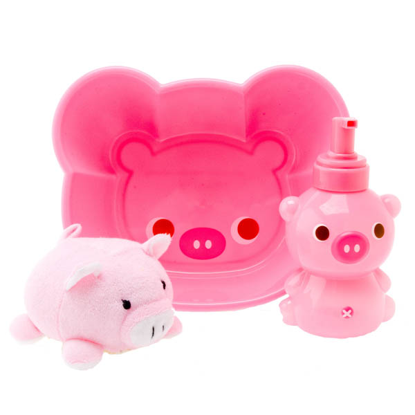 Das Set besteht aus einer Aufbewahrungs-Schüssel mit Schweinchen-Gesicht, einem Spieltier für die Badewanne und einem witzigen Seifenspender.