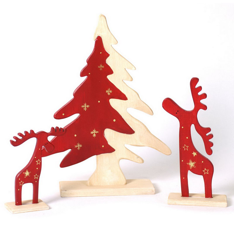 Der Tannenbaum und die beiden Rentiere sind in Handarbeit aus rot-lasiertem und naturfarbenem Holz angefertigt worden. Sowohl der Weihnachtsbaum als auch die beiden schick abstrakten Rentierkörper sind mit goldfarbenen Ornamenten verziert.