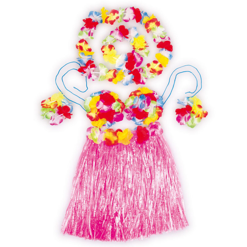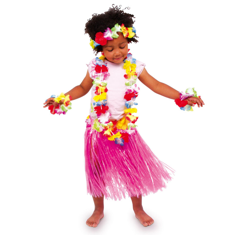 Gute Laune und bunte Farben versprüht dieses Kostüm, welches im Nu aus kleinen Mädchen süße Hawaii-Inselbewohnerinnen werden läßt.