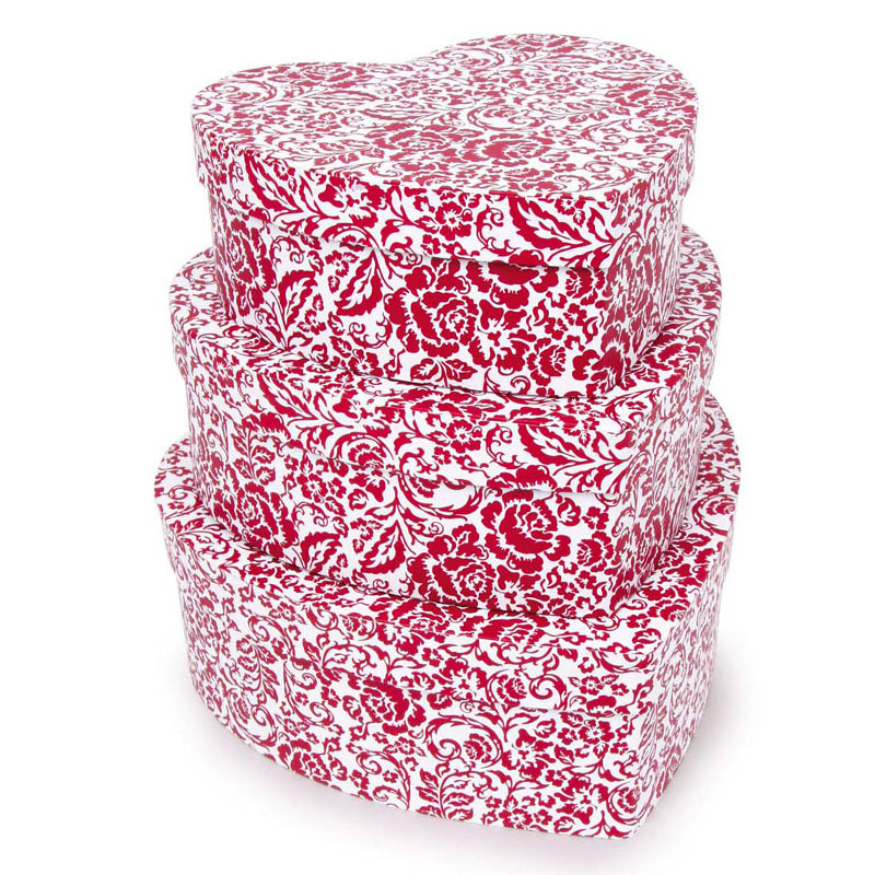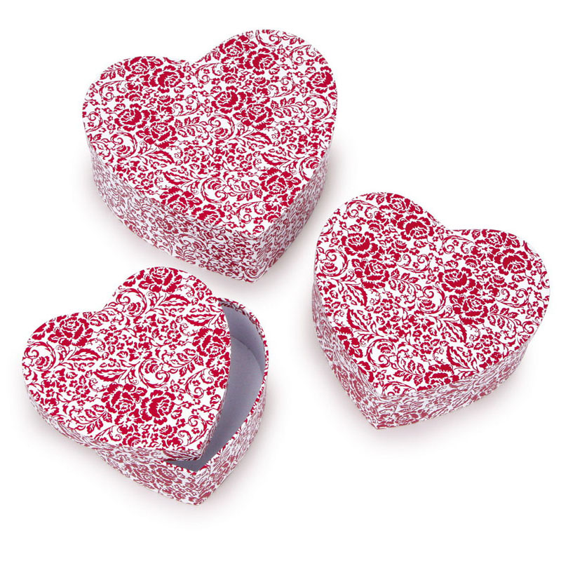 Diese drei schicken Herz-Dosen mit weinroten Blütenornamenten eignen sich prima als Geschenkverpackung oder Aufbewahrungsschachteln.