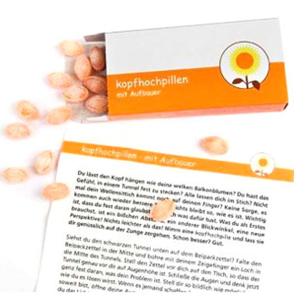 Wer den Kopf etwas hängen läßt, braucht eine kleine Aufmunterung! Kopfhochpillen mit Aufbauer - das sind leckere Bonbons mit Orangengeschmack und ein witziger Beipackzettel für das Licht am Ende des Tunnels.