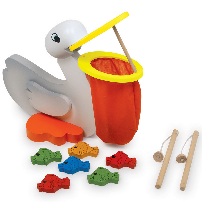 Bei diesem spannenden Angelspiel wird die Geschicklichkeit und Konzentration gefördert. Vorsichtig müssen die bunten Fische aus dem Maul des Pelikans geangelt werden. Hier ist ein ruhiges Händchen gefragt, denn der Pelikan gibt seinen Fang nicht so einfach wieder heraus. Der Schnabel, welcher nur durch ein wackeliges Holzstäbchen offengehalten wird, schließt sich bei Berührung ganz schnell.