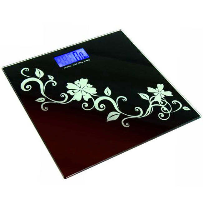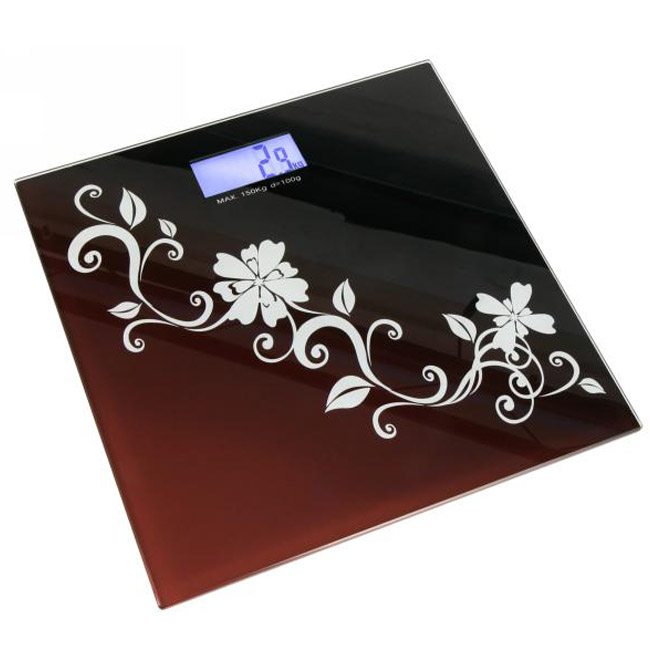 Besonders flache Personenwaage mit gehärteter Glaswiegefläche, LCD-Display mit blauer Hintergrundbeleuchtung, Abschaltautomatik, schickem Flower-Tribal und einer von schwarz nach bordeauxrot verlaufenden Farbgebung.