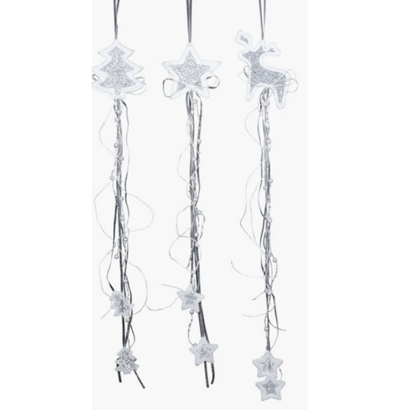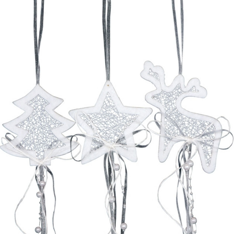 Leicht im Design und ganz unaufdringlich sind diese Filzhänger in weiß. Drei Filzmotive mit gewebtem Innennetz, Gazebändern und schillernden Acrylperlen an Schnüren als filigrane Hängedekoration für die Weihnachtszeit.