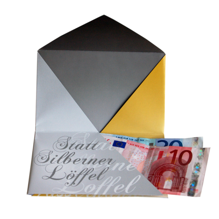 Der Text entfaltet sich nach und nach beim Öffnen der Karte und unterstreicht den Sinn oder Anlass des Geldgeschenks: "Statt Silberner Löffel - oder Goldener Wasserhähne - Lieber eine eiserne Reserve!"