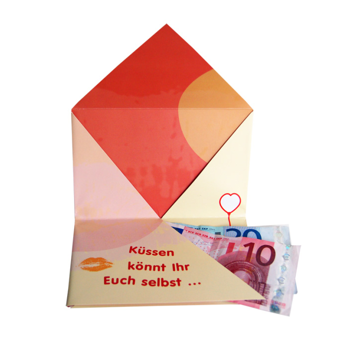 Der Text entfaltet sich nach und nach beim Öffnen der Karte und unterstreicht den Sinn oder Anlass des Geldgeschenks: "Küssen könnt Ihr Euch selbst - Händchen halten könnt Ihr selbst - Aber von Lust und Liebe wollt Ihr doch auch nicht leben."