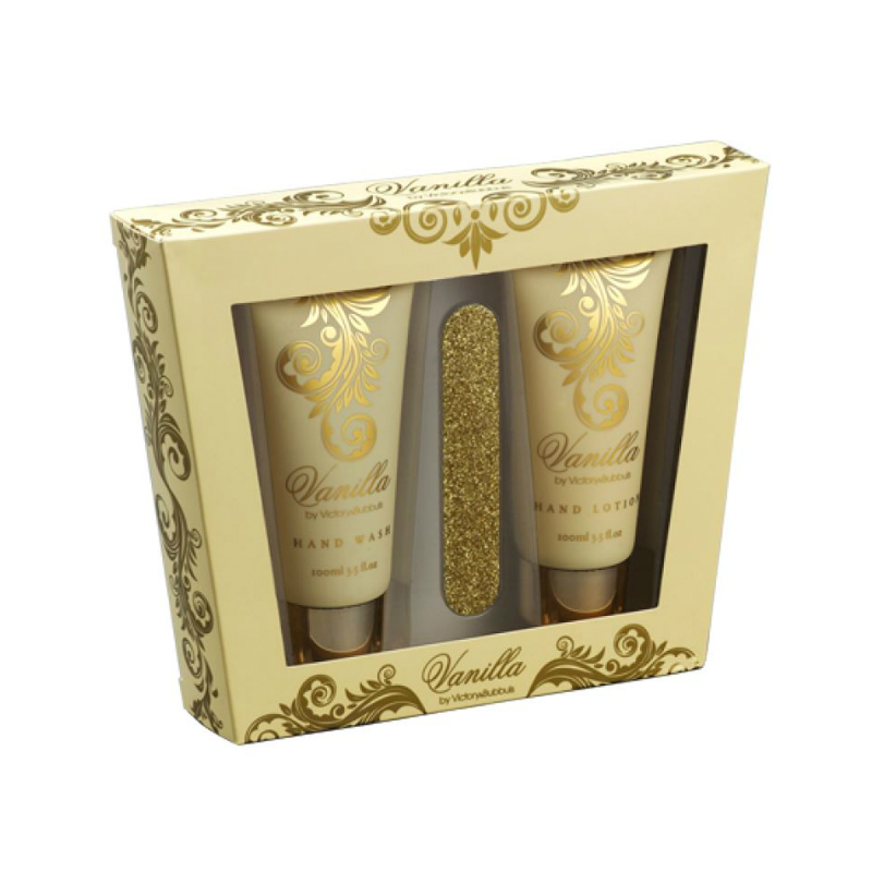 Das nach Vanille duftende Geschenkset für zarte und geschmeidige Hände, spendet Feuchtigkeit und bietet ausreichend Pflege und Schutz. Das 3-teilige Set besteht aus: Handlotion (100 ml), Handseife (100 ml) und einer gold glitzernden Nagelfeile.