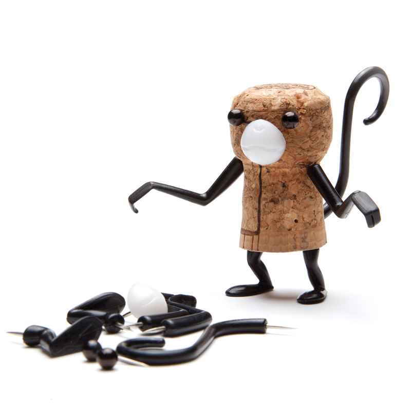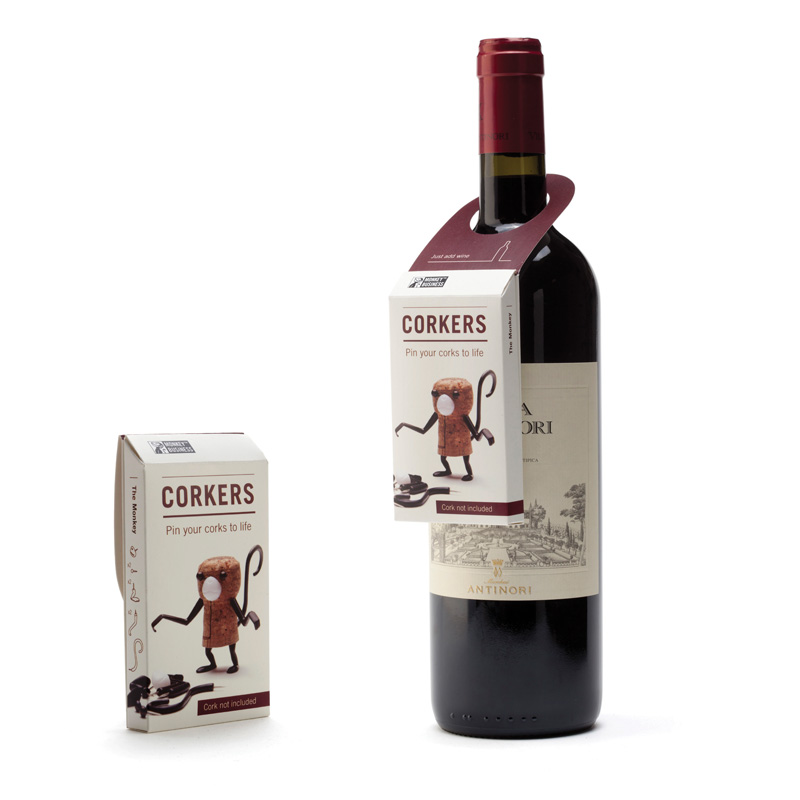Ein Päckchen "Corkers" für ein witziges Korkentierchen am Flaschenhals einer Weinflasche macht aus einer einfachen Flasche Wein gleich ein ganz besonderes, individuelles und witziges Geschenk. Das Päckchen lässt sich ganz einfach um den Weinflaschenhals hängen und enthält alle Körperteile um aus einem einfachen Weinkorken einen Affen zu basteln.