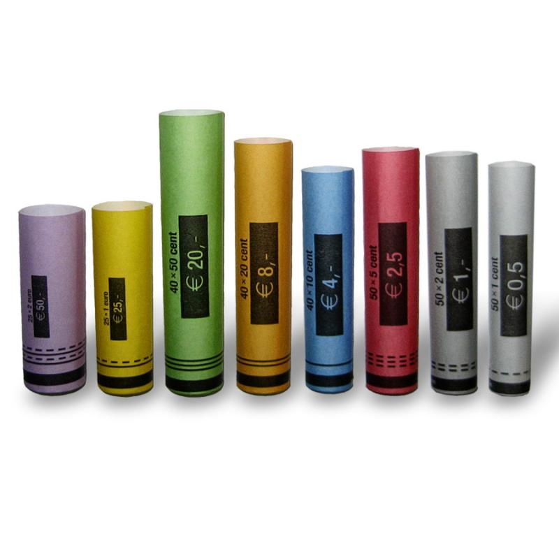Die Münzhülsen in sortendifferenzierten Papierfarben eignen sich besonders um Erspartes bei der Bank einzureichen. Die Papierhülsen sind bereits vorgefertigt und an einer Seite verschlossen. So braucht man nur die passenden Münzen einzuwerfen und die offene Seite zu verschliessen. Die Münzhülsen sind genormt und mit Angaben zu Münzsorte, Anzahl und Wert versehen und werden daher von allen Banken akzeptiert.