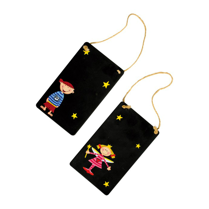 Die 2 niedlichen Namensschilder können individuell mit Kreide beschriftet werden und an die Kinderzimmertür, das Baumhaus oder den Lieblingsplatz angebracht werden. So weiß jeder, wer hinter der Tür wohnt oder wo dein Lieblingsplatz ist. Im Lieferumfand sind je ein "Mädchen-" und ein "Jungsschild" enthalten.