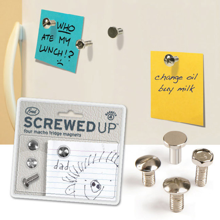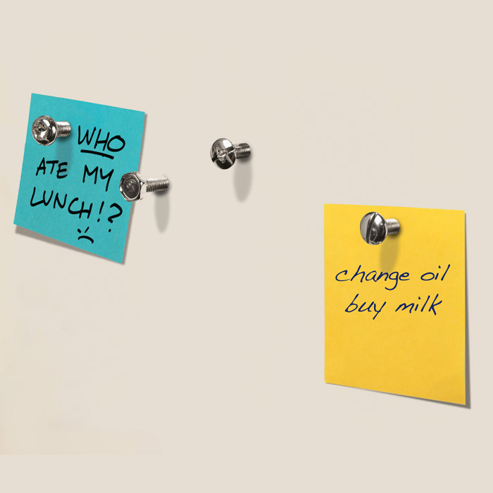 Haben Sie es auch satt die kleinen Zettelchen die dem Gedächtnis auf die Sprünge helfen sollen zu verlegen oder zu verlieren? Sie könnten Sie auch einfach am Kühlschrank festschrauben! Da kommen Sie nicht weg und man hat seine Termine & Aufgaben immer im Blick. Nach einer Weile wäre Ihr Kühlschrank aber sicher ziemlich durhlöchert und unansehnlich. Unsere Schrauben sind dank integrierten Hochleistungsmagneten da etwas schonender.