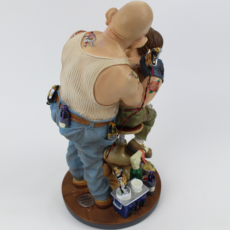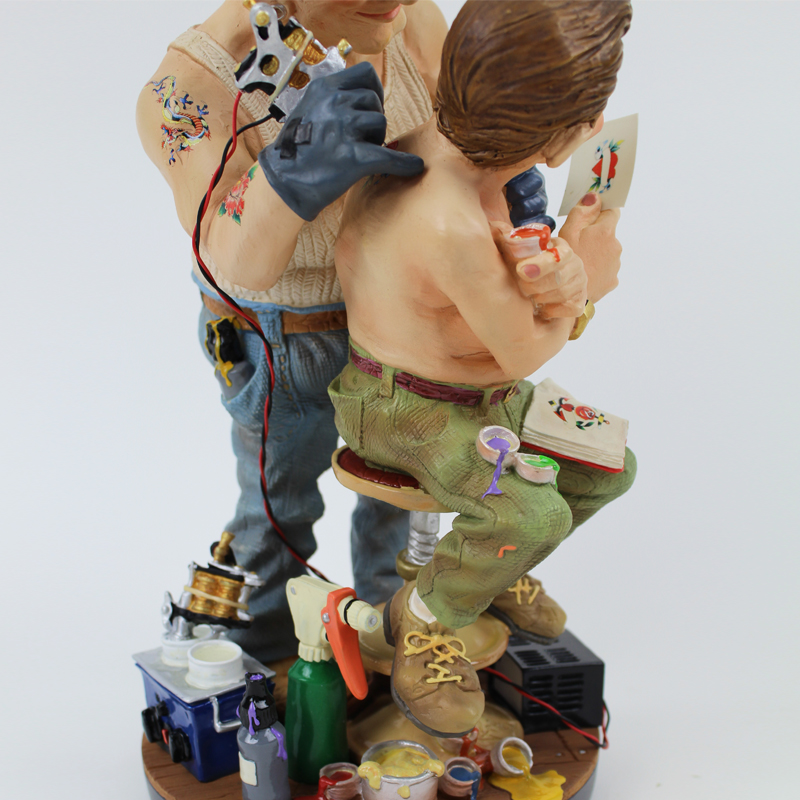 Mit außergewöhnlicher Liebe zum Detail erschufen die Künstler diese Szene aus dem Berufsleben des Tätowierers. In liebevoller Handarbeit aus Kunststein gefertigt und aufwendig bemalt ist diese Skulptur aus der Serie Profisti ein einzigartiges Kunstwerk aus dem Hause parastone. Als Geschenkidee für Tätowierer und Tattoo-Künstler kommt die Figur garantiert blendend an, denn sie wird zu einem echten Hingucker in jedem Tattoo-Studio.