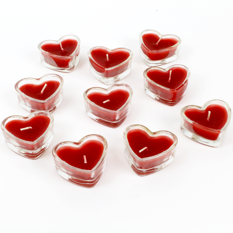 Romantisches Teelicht-Set für alle Verliebten. Die wunderschönen Glashalter in Herzform mit roten Kerzenwachs geben genau die richtige und sinnliche Atmosphäre.