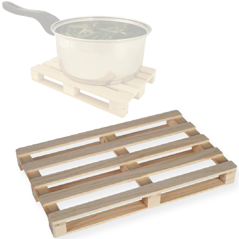 Die klassische Europalette aus reinem Holz eigent sich auch perfekt als Topfuntersetzer. Mit einem Gewicht von nur 40 Gramm benötigen Sie aber weder Gabelstapler noch Hubwagen um die Palette auf dem Esstisch abzusetzen. Laden Sie heiße Töpfe einfach auf Ihr ab und verstauen Sie sie danach einfach wieder platzsparend im Schrank.