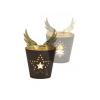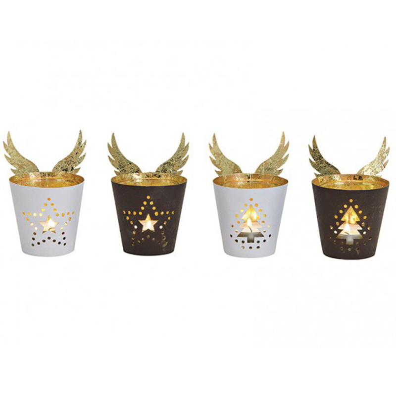 Diese dekorativen Windlichter aus Glas kommen je in einem weihnachtlich verzierten Metallbecher mit einer besonderen Ausstanzung in den Motiven Tanne oder Stern. Die Metallbecher haben alle goldene Engelsflügel und sind auf der Innenseite im Shabby-Chic Look gold Lackiert, so dass die Umgebung in ein stimmungsvolles Licht getaucht wird. Wahlweise gibt es das Windlicht in weiß oder braun. Die Auswahl des Motivs Tanne oder Stern ist zufällig.