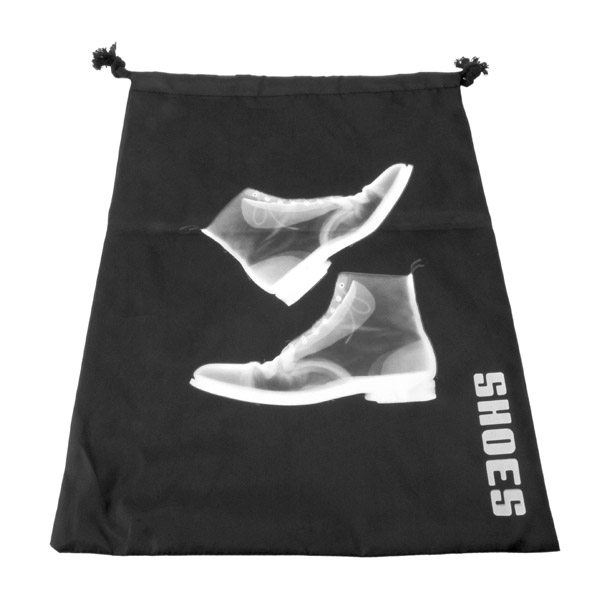 Die schwarze, undurchsichtige Tasche verwahrt Schuhe optimal. Damit man trotzdem sieht was drin steckt, ist sie mit dem passenden Röntgenbild bedruckt.